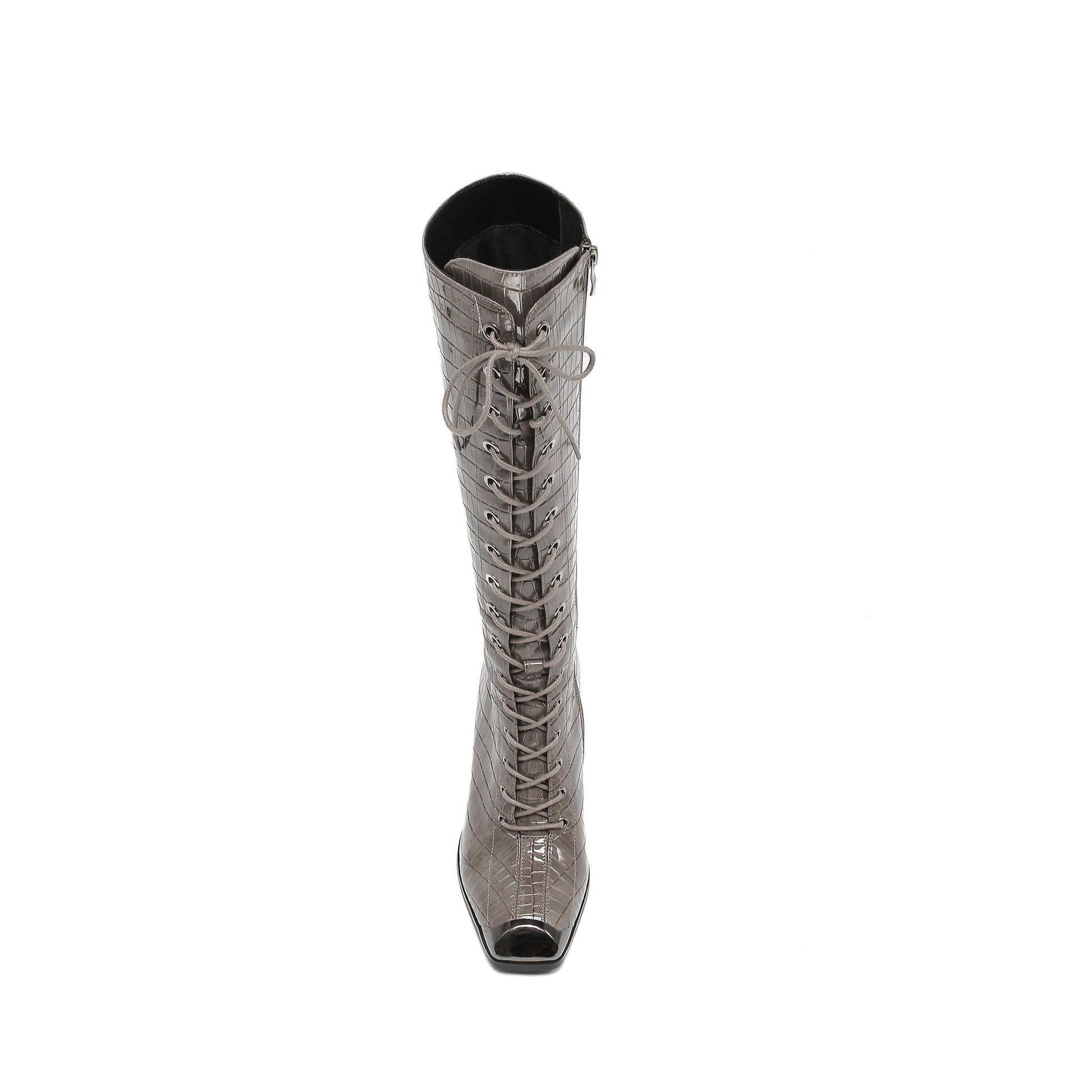 This Classy Ninety Union Fuji Boot. This knee-high features a bold lace-up front with a chunky block heel and croc-print finish for added style.